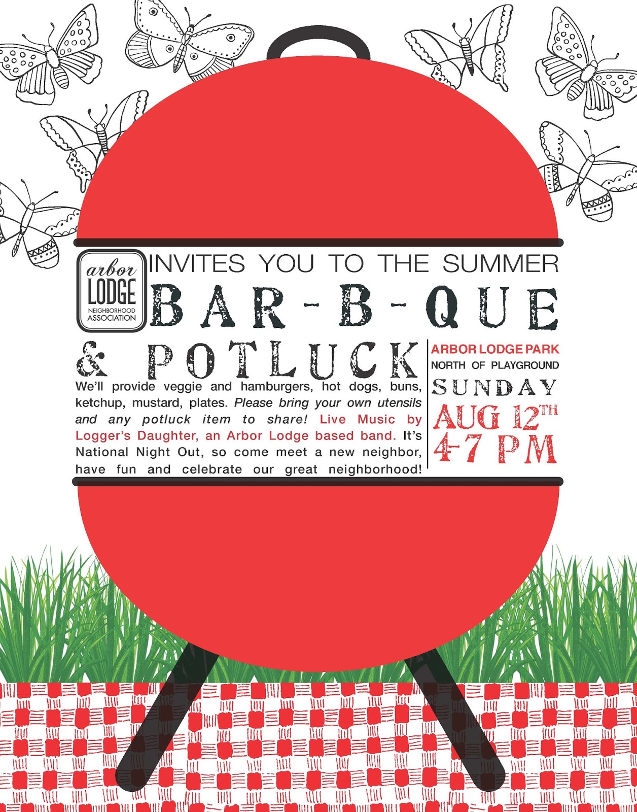 BBQ time!What? ALNA Summer BBQWhen? Sunday, August 12th, 4-7Where? Arbor Lodge Park - near the playgroundFood you say? YES! We will provide veggie burgers, hamburgers, hot dogs, buns and fixings. You can bring something to shareDid I hear Music? YES! Logger's Daughter, a local Arbor Lodge Band will be there to entertain youThis is an official National Night Out Event, we will have some info for you from our Neighborhood Emergency Preparedness team, we hope for others too.See you there! Let's Party in the Park
