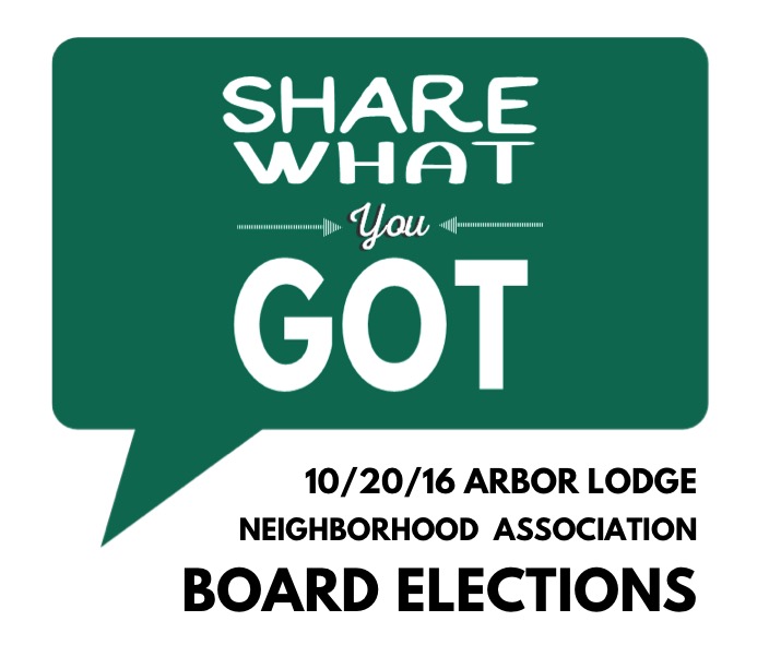 Join us for our Annual Membership and Elections meeting Thursday, October 20th. All positions are open to new candidates each year, so if you are interested in being part of the Arbor Lodge Neighborhood Association Board, let us know!